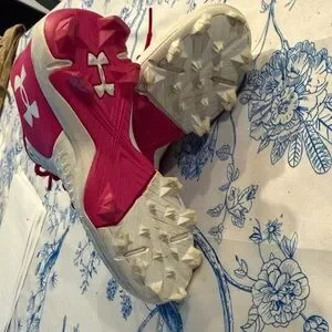 Under Armour youth athletic cleats in white with pink accents. Textured upper for ball control. Padded collar and tongue for comfort. Molded studs for traction on turf or grass.
