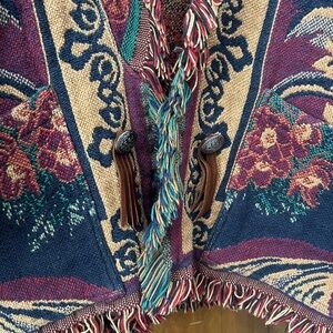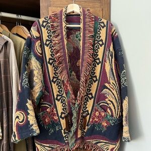 Bold tapestry knit cardigan with large sunflower and floral motif. Rich green, burgundy and gold colorway. Textured woven construction. Statement vintage-inspired outerwear piece.
