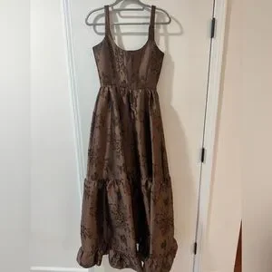 Elegant brown floral jacquard maxi dress with a fitted bodice and tiered skirt. Sleeveless design offers a flattering scoop neckline. Luxurious fabric with subtle floral pattern for evening and special occasions. Brown color adds warm, sophisticated appeal.