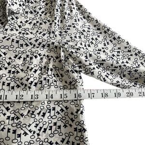 Classic J.Crew silk blouse in white with a playful black key print. Features a club collar, button-up front, long sleeves with functional cuffs, and a chest pocket. Perfect for work, casual, or dressier occasions.