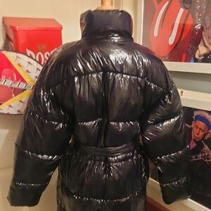 Statement belted maxi coat from PrettyLittleThing. Glossy high-shine surface for a sleek look. Self-tie belt defines the waist. Longline silhouette for full coverage. Modern and eye-catching outerwear.