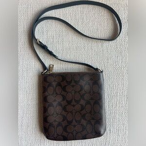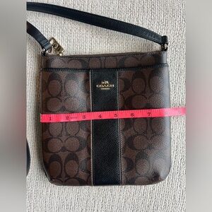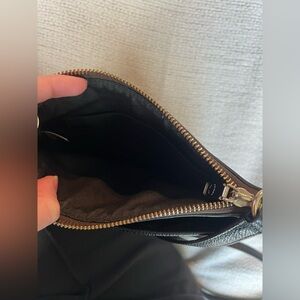 Elegant Coach shoulder bag with signature pattern. Features a sleek black strap and secure zip closure.