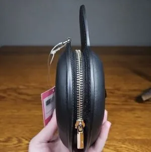 Features cat motif with stone eyes, a pink nose and 3D ears. Custom hardware.