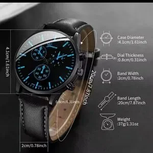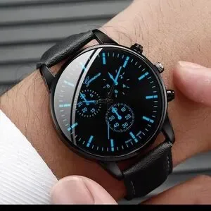 Stylish black watch with a blue-accented dial. Features a sleek leather band.