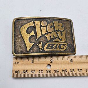 This vintage 1980s "Flick My BIC" brass belt buckle features a retro and collectible design with bold lettering and iconic branding. Measures approximately 3"x2". USA Made.