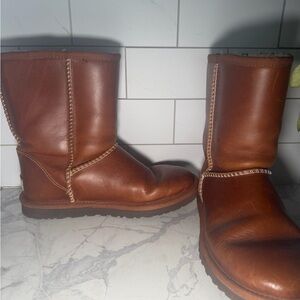 UGG leather boots in rich chestnut brown. Whipstitch detailing along seams. Pull-on silhouette with branded heel patch. Timeless, casual design.