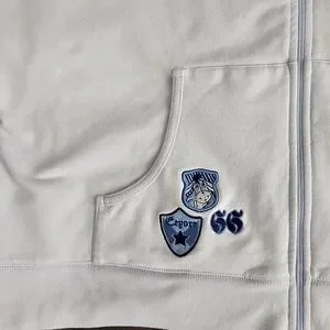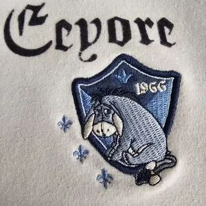 The light blue (or baby blue) jacket features white and blue stripes down the sleeves and various embroidered "Eeyore" patches, including a chest crest and a "66" shield on the lower pocket.