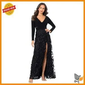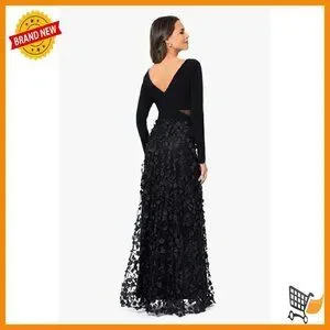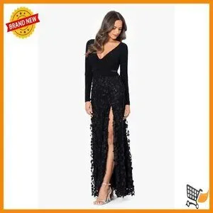 Brand new, never worn, and in flawless condition — this elegant gown features a plunging V-neckline, long sleeves, and a stunning floral applique skirt for a sophisticated and feminine look perfect for formal occasions. The fabric has a comfortable stretch and the silhouette is fitted at the waist with a graceful flow over the hips.