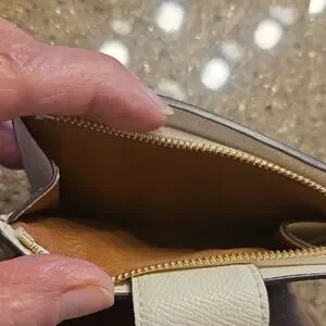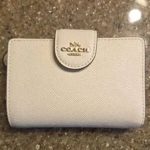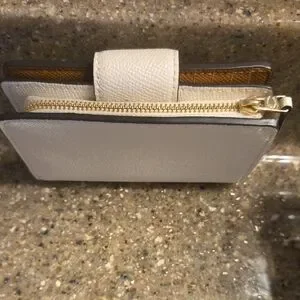 Chic cream leather wallet by Coach. Features a gold logo detail. Zipped compartment for change, place for license and credit cards, also for bills. New without tags. Never been used.