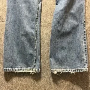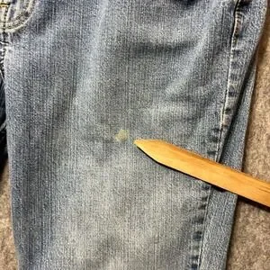 Classic bootcut jeans in a light wash denim. These jeans feature a traditional five-pocket design, a comfortable mid-rise waist, and a flattering bootcut leg opening. The denim has a slight stretch for added comfort and flexibility. There is a small spot on the front of the left leg and some fraying on the hems.