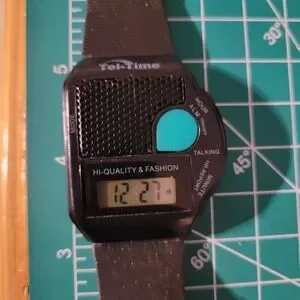 This is a vintage, working, Tel-Time digital talking watch in excellent condition. Push the green button and it calls out the current time. Super cool piece.
