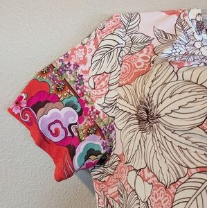Bright floral design with intricate patterns. Features red, pink, and cream tones. Perfect for casual wear. Size medium.