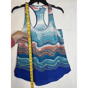This is a Trina Turk tank top in size S, made of silk with a multicolor pattern featuring a unique Agate Caspian Swirl Wave design. It has a scoop neck and a racerback style with a pullover closure. The top is sleeveless and unlined, making it a stylish and comfortable choice for women's casual wear.