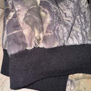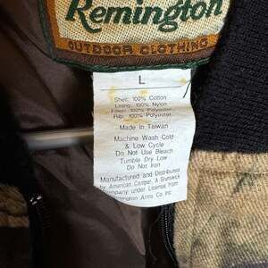 Vintage 90s Remington Camo Bomber Jacket for men, size Large. This classic piece features a natural camouflage pattern, perfect for outdoor enthusiasts or retro style aficionados. The jacket is designed with a full zipper closure and ribbed cuffs/hem for a comfortable fit. Ideal for layering, this bomber jacket brings a touch of vintage ruggedness to any wardrobe. Excellent pre-owned condition, see photos for minor hole at bottom of jacket
