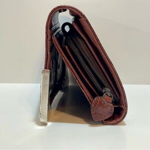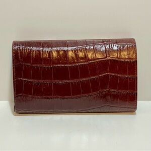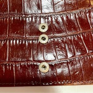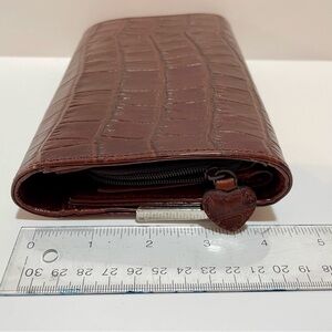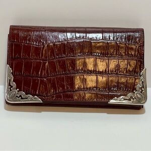 Stylish Brighton brown clutch featuring luxurious crocodile-embossed leather exterior for a rich, textured high-end look. Elegant silver-colored accents and a cute heart-shaped zipper pull add that signature Brighton sophistication and charm. All zippers are fully functional, and the spacious wallet-style interior holds plenty (cards, cash, phone, keys—great organizer capacity!). Detachable shoulder strap is missing (use as a classic clutch or add your own strap/chain). Minor visible wear on the inside silver hardware only (light scuffs—see photos); no scratches, flaws, or damage on the leather exterior, interior fabric, or exterior hardware. Clean and ready to elevate any outfit! Perfect for evenings, date nights, parties, or sophisticated everyday use. Smoke-free home. Ships quickly. Make me an offer!"