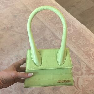 Compact Jacquemus top-handle mini bag in lime green croc-effect leather. Structured silhouette with a curved wrapped handle. Subtle gold Jacquemus logo hardware. Ideal for adding a pop of color to outfits.