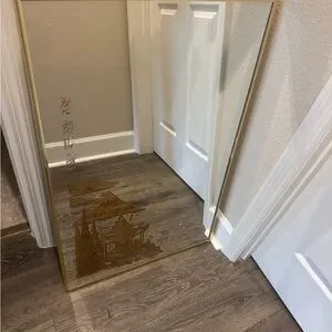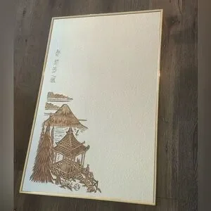 Elegant Framed 1960’s Mirror 34 X 22 With Etched Gold Calligraphy And Japanese Pagoda, Mt. Fuji Perfect for home decor.
