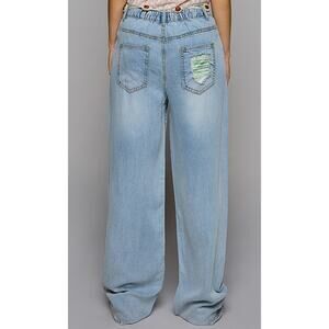Designed in wide pants in soft denim with colorful stitching and contrasting color lining
