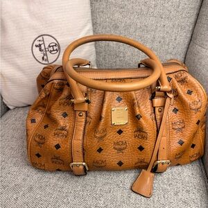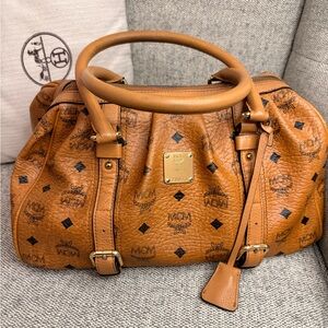 Stylish MCM satchel in cognac leather. Features iconic logo pattern. Ideal for versatile use.