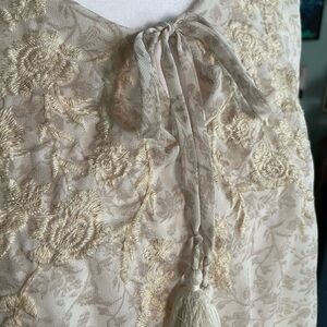 Cream sundress with subtle floral pattern. Sleeveless with a tassel tie at the neckline. Tiered hem for a flowy look. Soft neutral tones for versatile wear.