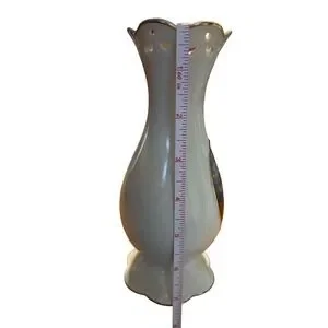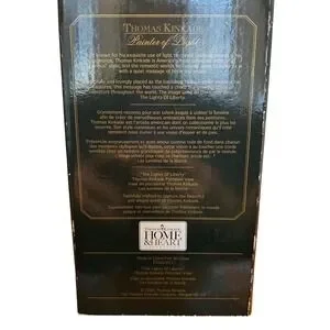 Thomas Kinkade "The Lights of Liberty" porcelain vase produced by Avon China. This elegant piece features a classic winter scene of the White House with a decorated Christmas tree, framed by a gold-tone border. The vase is crafted from white porcelain with a scalloped, pierced rim and a pedestal base, both accented with gold-tone trim. It comes in its original box, making it a wonderful addition to any holiday decor or Thomas Kinkade collection.