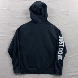 Nike Sportswear full-zip hoodie in black features a bold "JUST DO IT." graphic printed down the right sleeve and a contrasting orange logo patch on the chest. Constructed from a comfortable cotton-blend fleece, this hoodie includes a drawstring hood, split kangaroo pockets, and ribbed cuffs and hem for a classic athletic fit. The interior is lined with soft brushed fleece for added warmth.