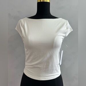 Classic white boatneck top with cap sleeves. Soft, stretch fabric for everyday comfort. Clean, versatile style that pairs easily with jeans or skirts. Brand not specified.