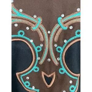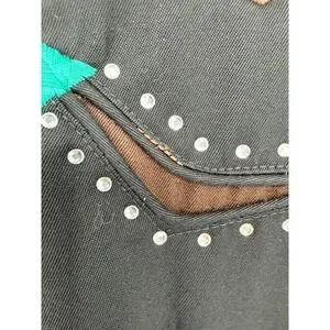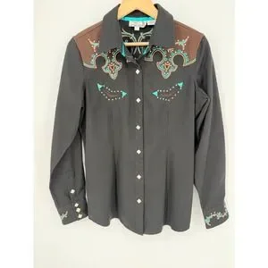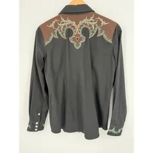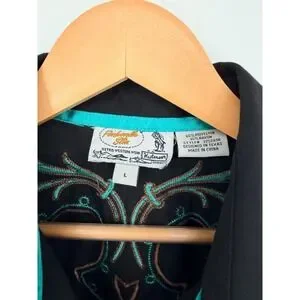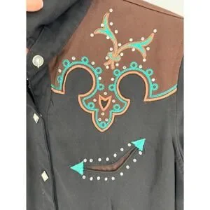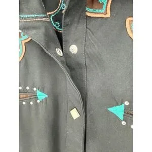 Panhandle Slim Retro Western Wear button-down shirt showcases intricate turquoise and brown embroidery with shimmering rhinestone accents on the yoke, faux smile pockets, and cuffs. This black long-sleeve top features a classic pointed collar and unique diamond-shaped pearlized snaps for a polished cowgirl aesthetic. Crafted from a durable polyester and rayon blend, it offers a structured yet comfortable fit perfect for rodeos, line dancing, or western-themed events.