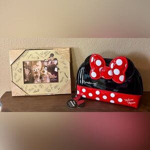 Adorable Disney Parks bundle featuring a Minnie Mouse makeup bag and a Disney character photo frame. Both items are new with tags and perfect for Disney fans, collectors, or as a cute gift set.
