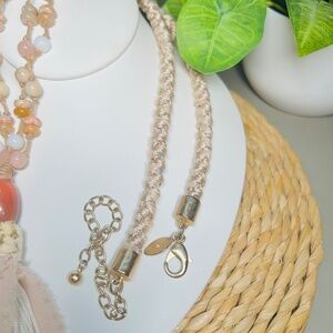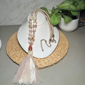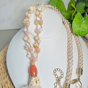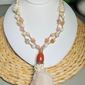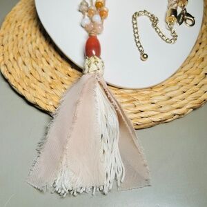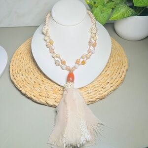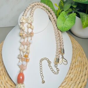 CHICO’S Coral and Cream colored double-strand tan and cream corded beaded necklace with a large coral tone pendant and a fabric tassel.