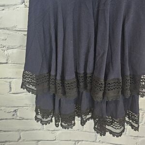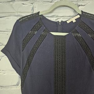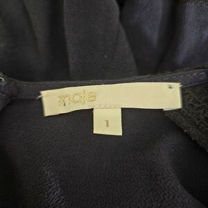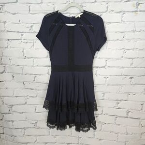 The Raglia dress from Maje is a short sleeve dress with a tiered skirt. It is navy with inset black lace and trim. It zips at the back. It is in good used condition. It is marked a size 1 which is equivalent to a US S. Bust: approx. 33 inches Waist: approx. 26 inches Length: approx. 35 inches