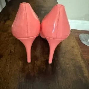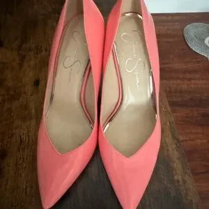 Sleek pointed-toe pumps by Jessica Simpson. Smooth, vibrant coral upper. Classic high heel silhouette. Versatile for dressy or casual looks. Easy to pair with summer outfits. Only worn twice.
