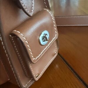 Compact Coach crossbody in smooth brown leather. Front flap with signature C hardware. Adjustable shoulder strap. Contrast stitching and buckle details. Clean, classic silhouette.