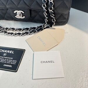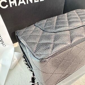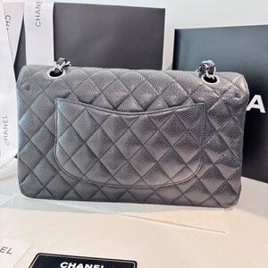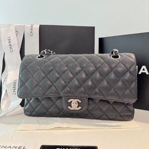 CHANEL - Classic Medium Flap, Caviar Black Leather, Silver Hardware, Full Set