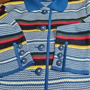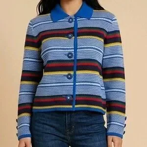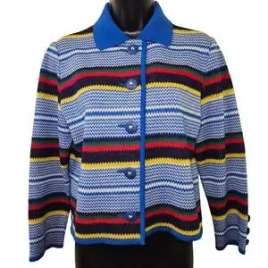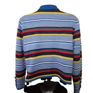 Elevate your wardrobe with this authentic Vintage Yves Saint Laurent (YSL) designer cardigan. This striking knit features a vibrant primary color striped pattern in shades of royal blue, red, yellow, and green, perfectly capturing the Nautical and Preppy Retro aesthetic.