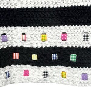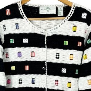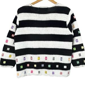 Vintage Design Options by Philip & Jane Gordon Knit Ramie Cotton Blend Black & White Striped & Fabric Square Patchwork Detail 1/2 Sleeve Cardigan Sweater in Gently Used Condition There is a Small Mark on Left Sleeve Cuff As Pictured No Other Flaws to Mention