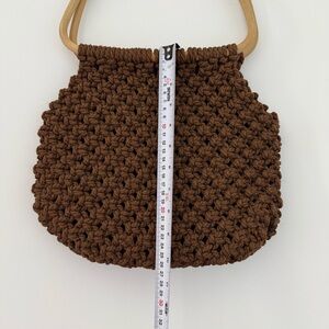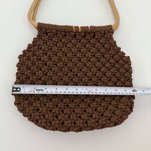 Vintage 1970s brown boho crochet knit tote bag with wood handles