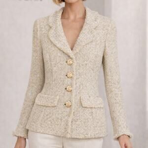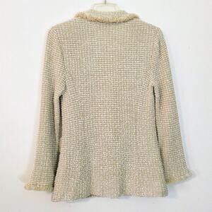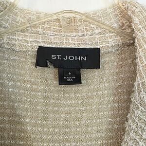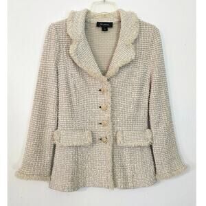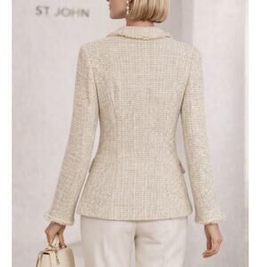 Classic elegance meets timeless craftsmanship in this St. John Tweed Blazer, beautifully tailored in a soft neutral palette. The textured tweed fabric, structured silhouette, and signature St. John gold-tone buttons create a polished, couture-inspired look. Fringe trim along the collar, faux pockets, and hem adds refined detail that elevates this wardrobe essential.