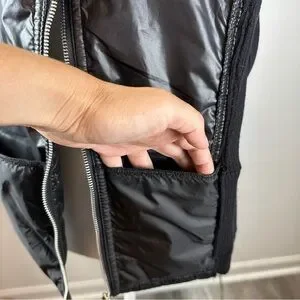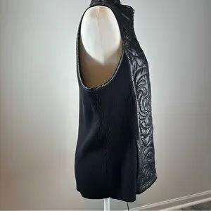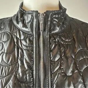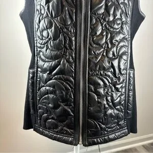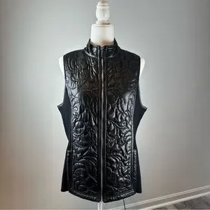 Elegant and versatile Chico’s Collection black quilted vest, featuring a gorgeous faux-leather front with intricate floral stitching and soft ribbed knit sides for a flattering fit. The zip-front design makes it perfect for layering over blouses or sweaters. Ideal for transitioning seasons — stylish enough for work, casual outings, or a night out.