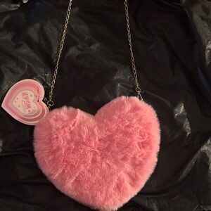 Cute pink heart-shaped furry bag with a gold chain strap. Perfect for adding a playful touch to any outfit.