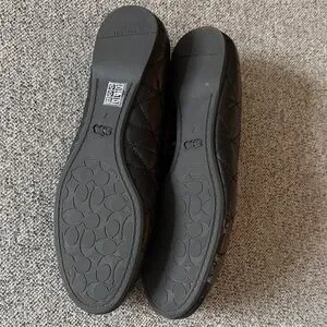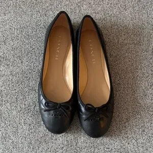 Sleek black leather flats by Coach. Timeless design with bow detail. Ideal for everyday wear.
