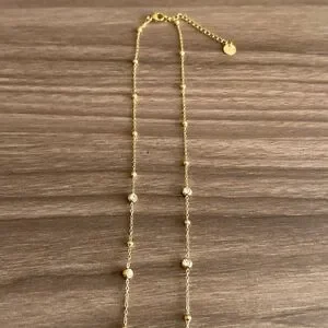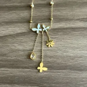 This exquisite gold butterfly pendant necklace adds a touch of elegance to any outfit. The delicate design features a charming butterfly motif, perfect for any occasion.