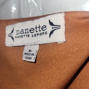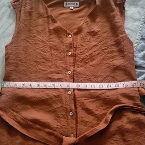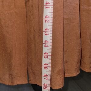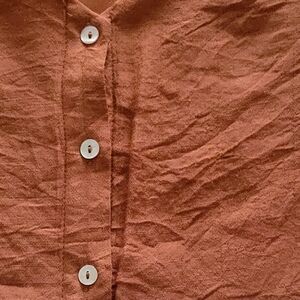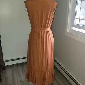 pretty rust/burnt orange color with large ruffled bottom. Button down v-neck with sash that ties at the waist. Size 6, like new condition