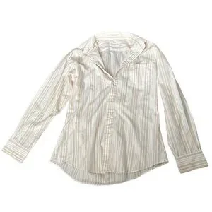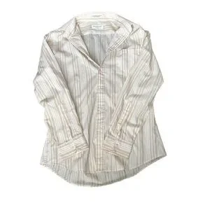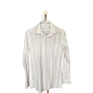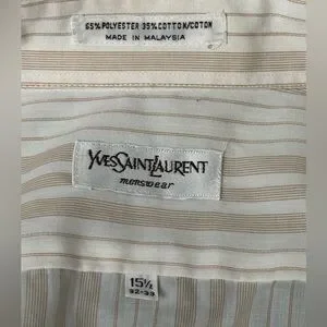 Elevate your wardrobe with this classic Yves Saint Laurent Menswear button-up. Featuring a sophisticated tan and white vertical stripe pattern, this shirt offers a timeless aesthetic perfect for the office or a polished weekend look.