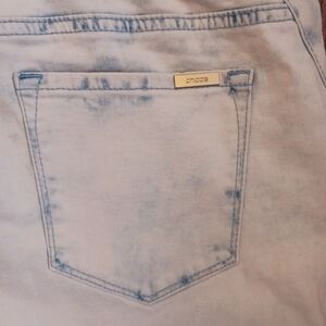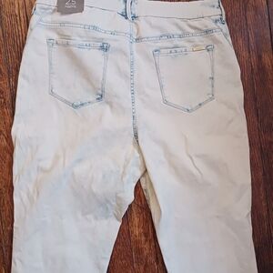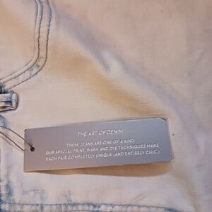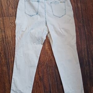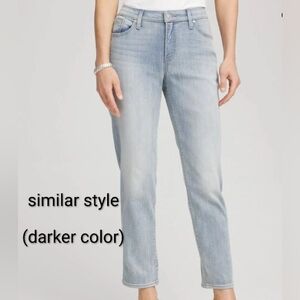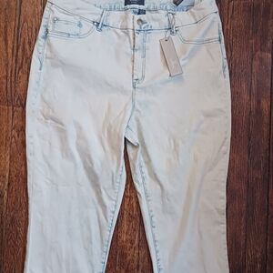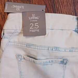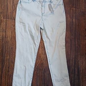 The product is a pair of new with tags. Chico's slimming jeggings in a size 2.5 (14- Long). These jeggings feature a slim fit and are designed specifically for tall women. They come in an off-white blue fade color and are styled as a jegging with a zip and button closure. The slimming feature is highlighted as a key attribute, making them a stylish and comfortable choice for everyday wear.