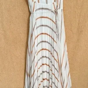 Flowing pleated dress with thin tan stripes. V-neck sleeveless bodice with a full twirl skirt. Lightweight, airy fabric for easy movement. Clean, understated summer styling.