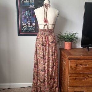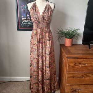 Flowing halter maxi dress in a pink paisley print. Smocked waist provides a comfortable, flattering fit. Deep V halter neckline and full skirt create effortless movement. Perfect for daytime events and warm-weather occasions.