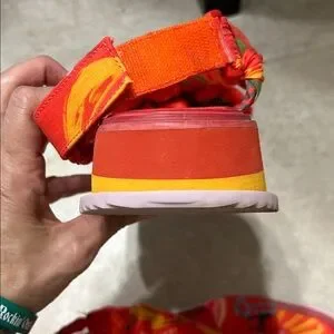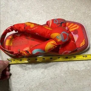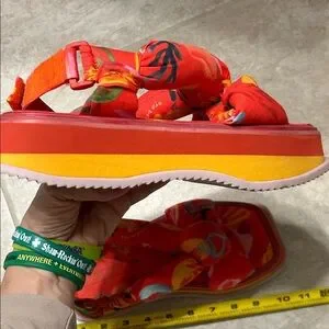 Bold red platform sandals with knotted fabric straps. Multicolor floral and abstract print accents. Cushioned footbed and layered sole. Playful summer statement piece. In good used condition.