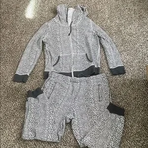 Stylish leopard print jogger set. Includes hoodie and pants. Comfortable and trendy.