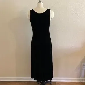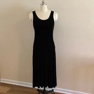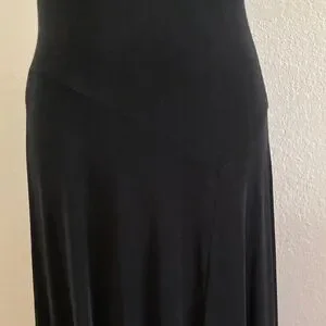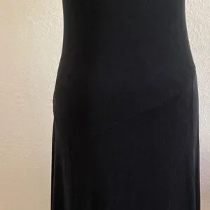 This chic black midi dress offers a sleek and versatile style for any occasion. Scoop neck with asymmetrical drop waist and flowing hem. Perfect for both day and night events. In well taken care of used condition.